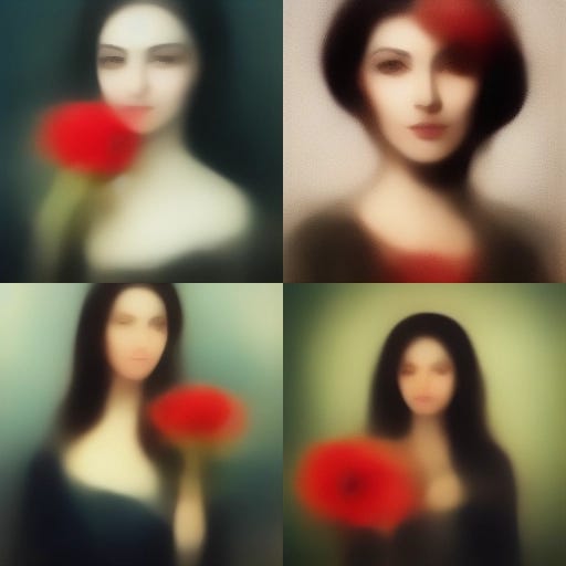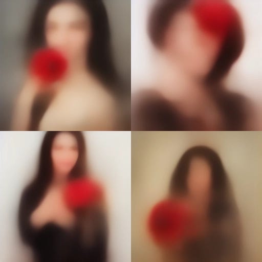The problem is that de-noising everything at once is way too difficult. So Midjourney splits the process into hundreds of gentle iterations. With each new iteration, the image is “nudged” to be more in line with the prompt. In the image below, you can compare the panels with the original static and see that the vague blurs and shapes have been subtly altered to become identifiable as a woman and a rose.