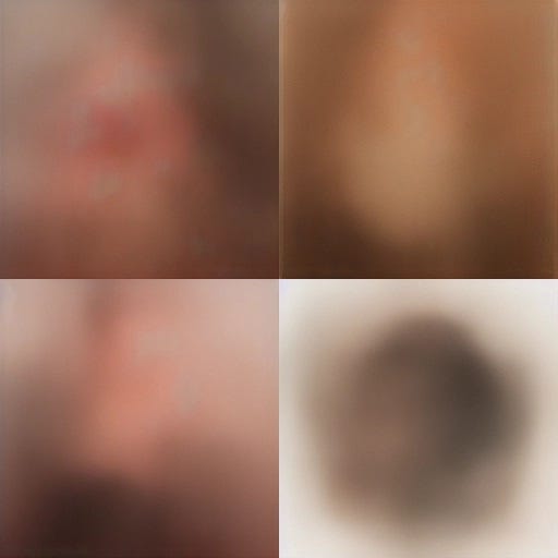 Midjourney starts with a panel of randomly generated static called a seed. Actually it starts with four of them; prompts are processed four times simultaneously so that the user can choose the result they like best. Below, you can see four such seeds; they are too blurry to make sense of right now. This is the raw material used to generate an image.