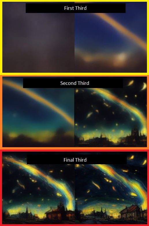 During AI art generation, when you request that a prompt be executed in the style of a specific artist (for example, the inimitable Van Gogh), some of the artist’s preferences regarding form and color appear during the first two thirds of the rendering, but it is only after the 60% mark that the subtleties that identify an artist’s style will appear.