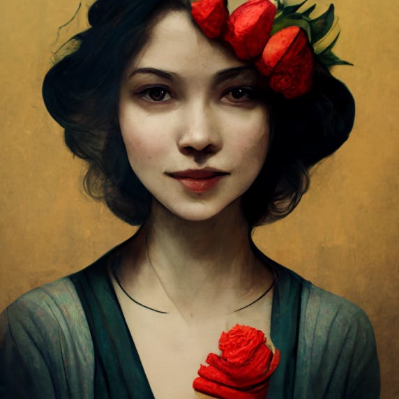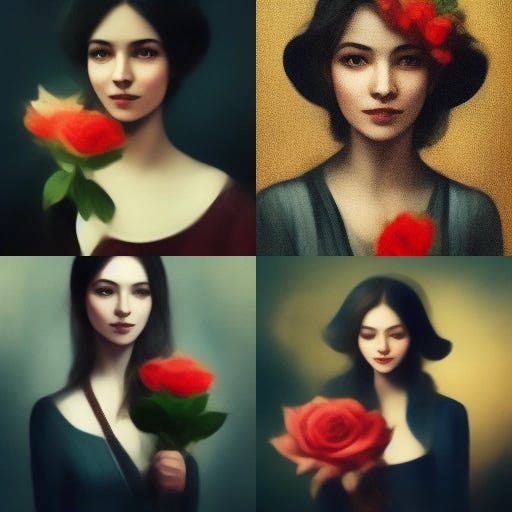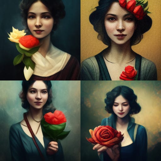 Call me crazy, but I think we writers can learn something from the answer to that question. Happily, the process is on clear display if you use Midjourney. I want to walk you through the creation of the image from my initial prompt (a beautiful woman holding a rose). Here it is, roughly divided into steps.